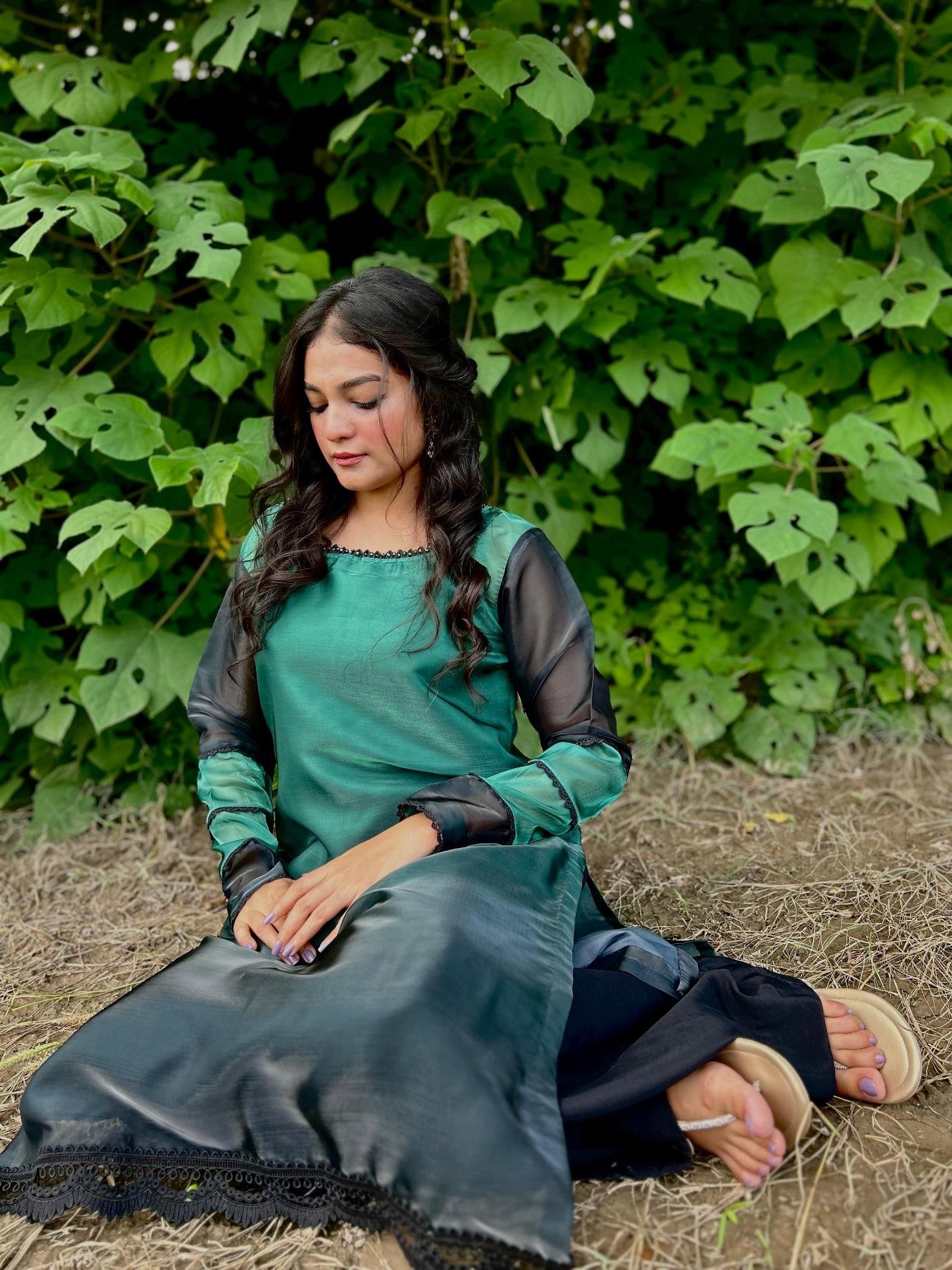 Step into timeless grace with this stunning two-tone outfit, featuring a rich emerald green shirt with sheer black sleeves and a flowing black hemline. The subtle shine of the fabric paired with intricate lace finishing at the border adds a touch of sophistication, making it a perfect choice for both festive evenings and semi-formal gatherings.