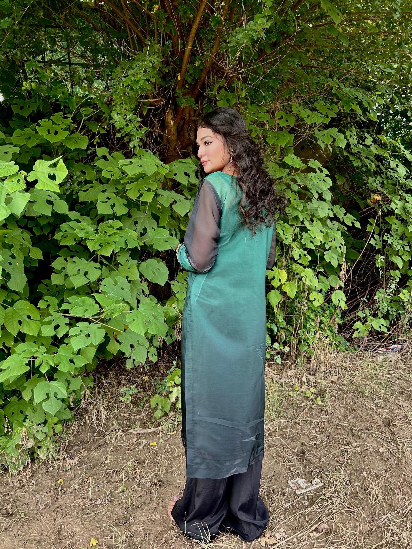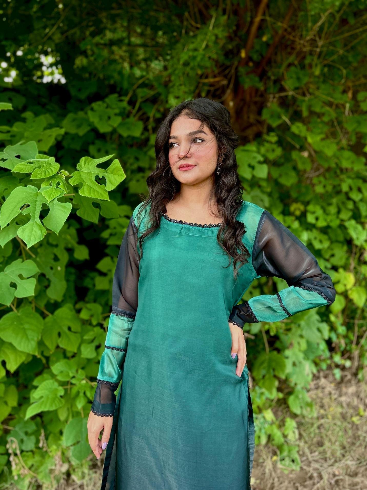 Step into timeless grace with this stunning two-tone outfit, featuring a rich emerald green shirt with sheer black sleeves and a flowing black hemline. The subtle shine of the fabric paired with intricate lace finishing at the border adds a touch of sophistication, making it a perfect choice for both festive evenings and semi-formal gatherings.