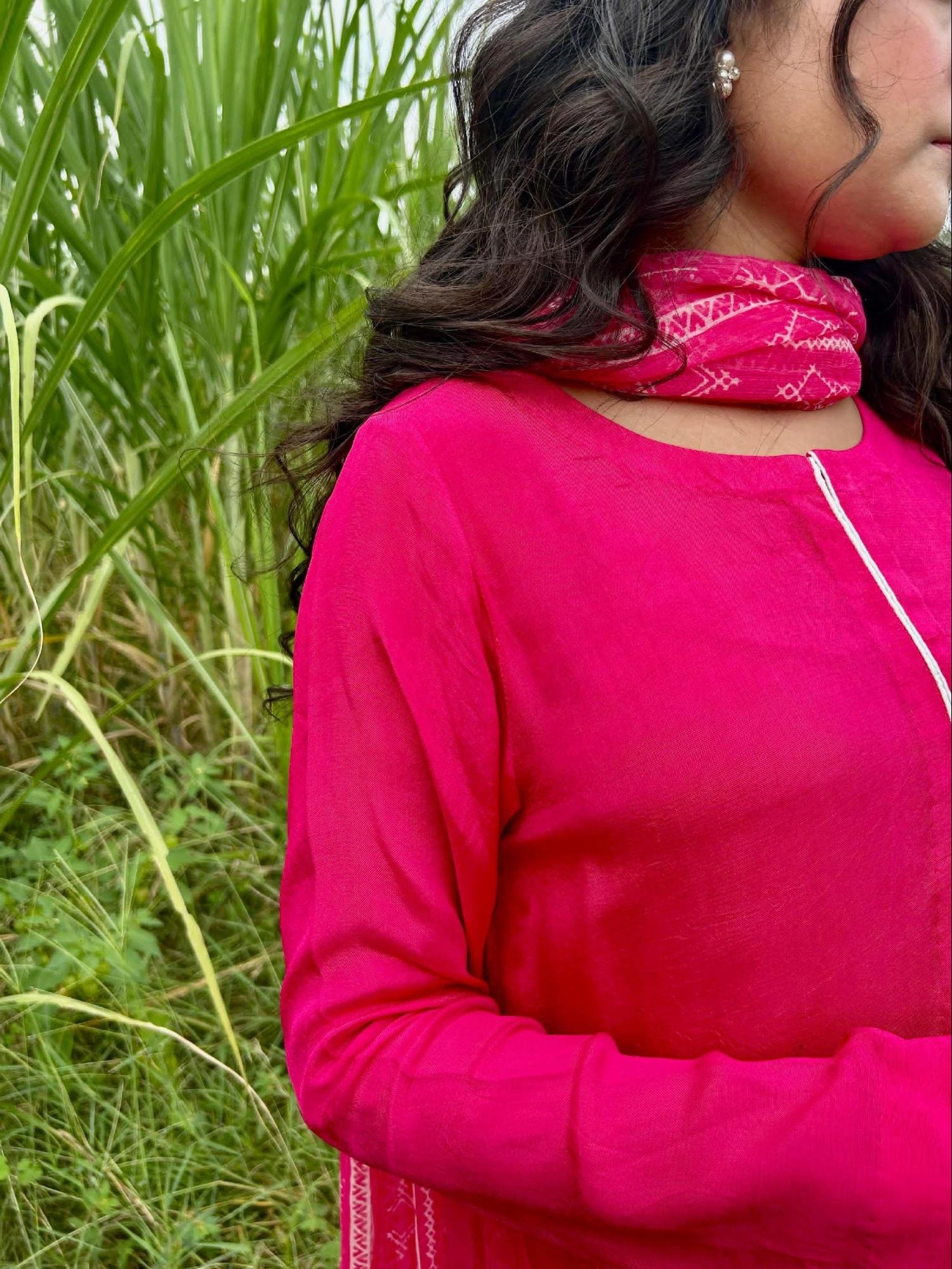 Dupatta: Paired with a printed chiffon dupatta, flowing gracefully with every step. Its airy texture balances the richness of the viscose, creating the perfect contrast.